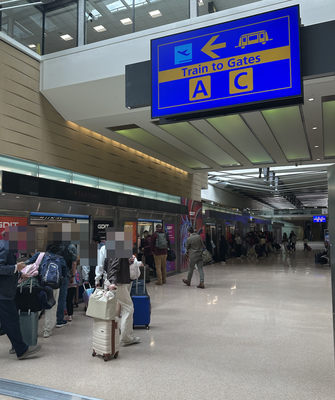 검색대를 통과한 후 내려가면 게이트로 이동하는 열차가 준비되어 있다. 차량 탑승 후 본인이 해당하는 게이트에서 내리시면 된다.